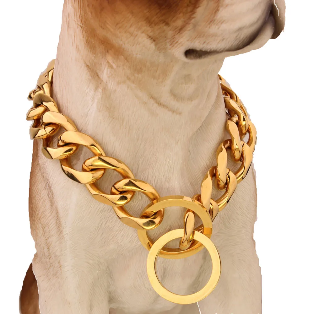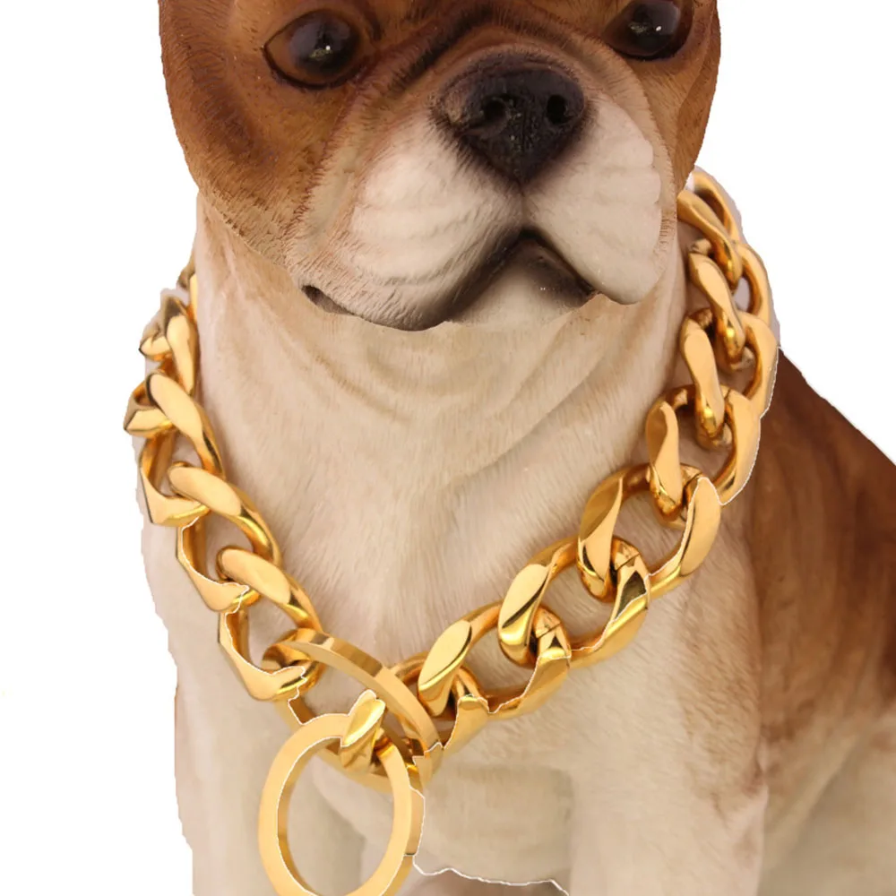 Pamper your furry friend with this luxurious Cuban Link Dog Collar. This will make your dog look cool and will stand out from the rest. It's 18K gold plated over 316L stainless steel chain, and the gold plating is 20X thicker than other gold plated chains. High strength and hardness, heavy, durable, no rust, or tarnish, guarantees durability.